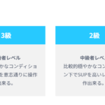 | レベル内容 | ◆3級(初級者レベル) 穏やかなコンディション下でSUPを意志通りに操作出来る。 ◆2級(中級者レベル) 穏やかなコンディション下でSUPを高いレベルで操作出来る。 ◆1級(上級者レベル) 波高1m、風速10m/sまでのコンディション下で高いレベルでのSUP操作が出来る。 |